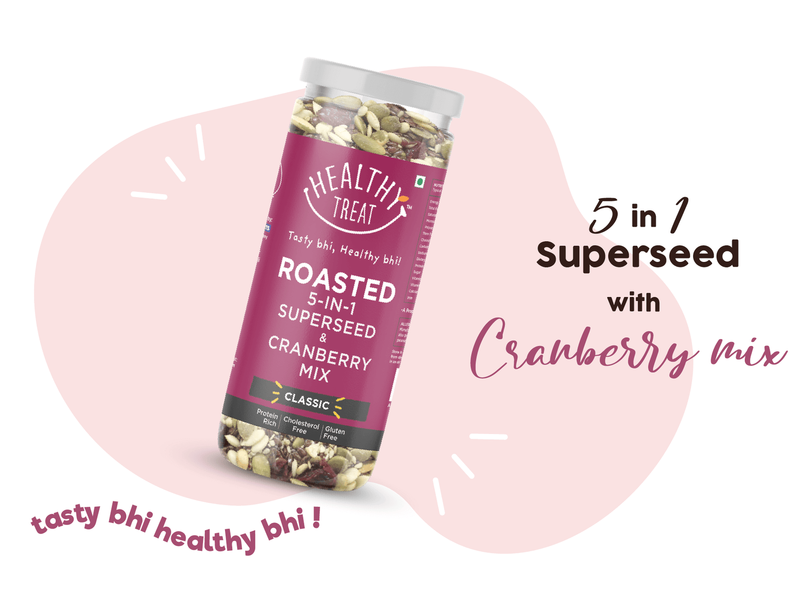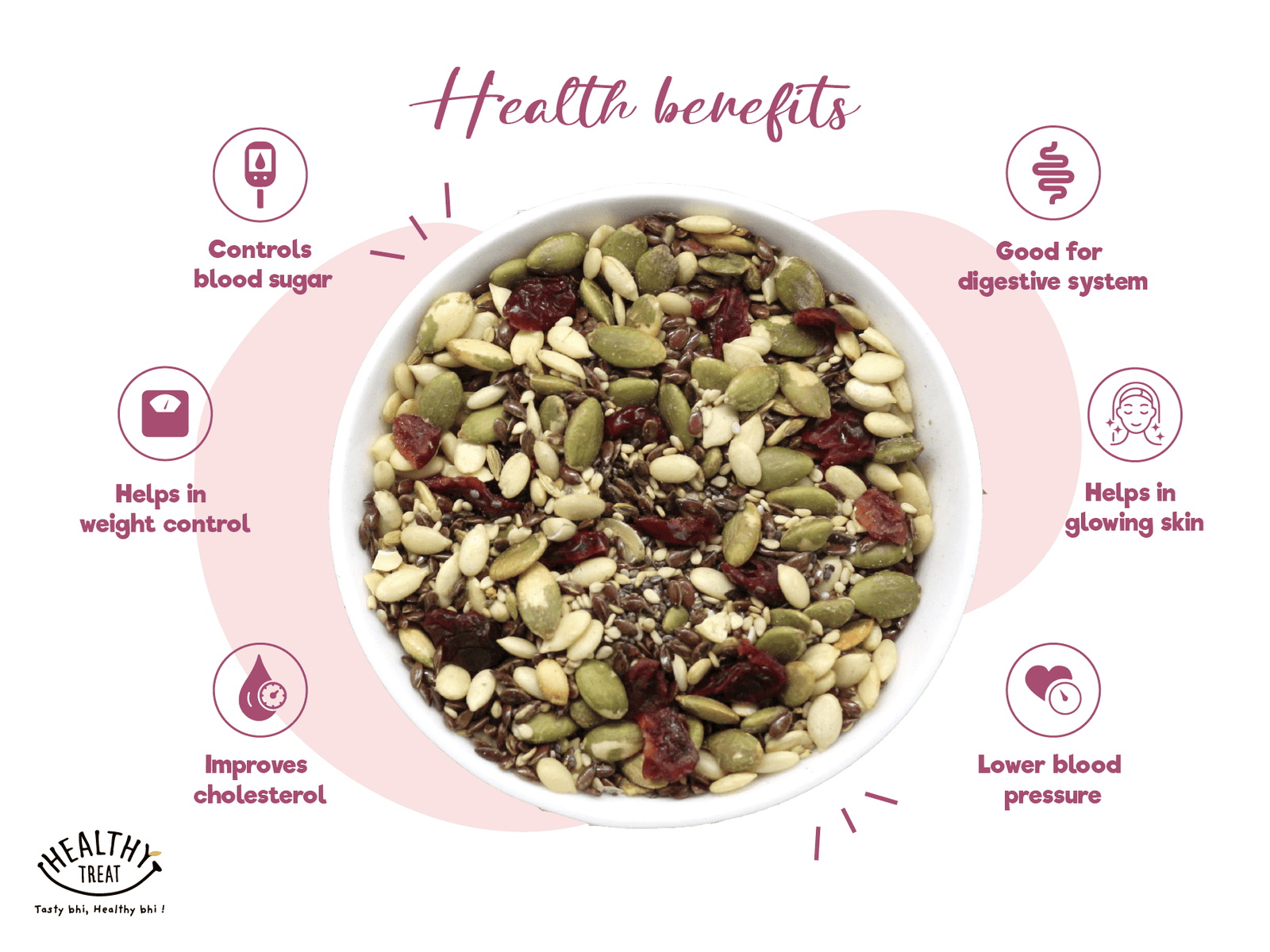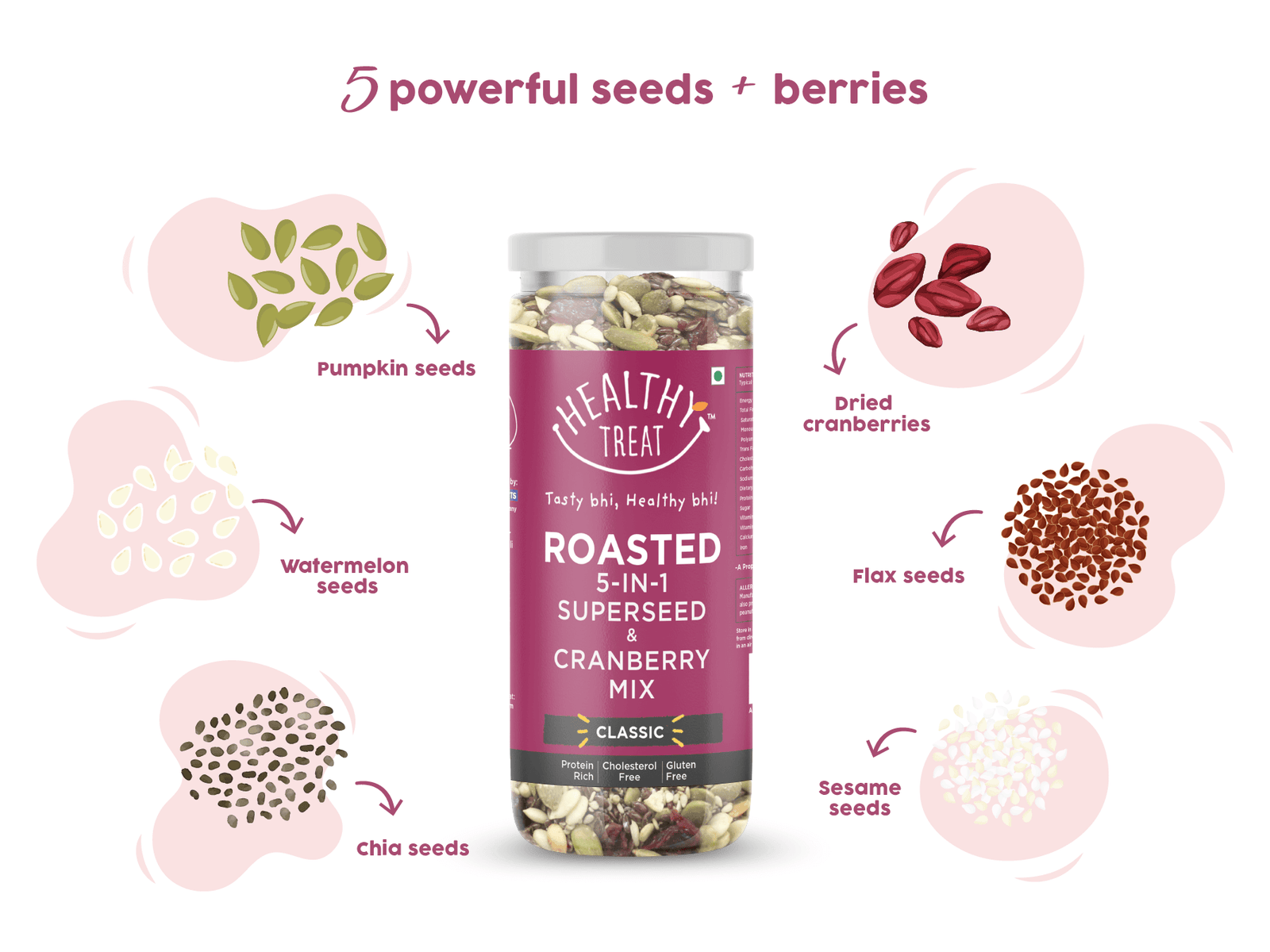 "Add some crunch to your life with Healthy Treat's Roasted 5 in 1 Super Mix Seeds Classic!" A mouthwatering blend of nutritious mixed seeds; "roasted pumpkin seeds, flax seeds, watermelon seeds, chia seeds, and sesame seeds" packed with flavor and health benefits. Elevate your snacking experience with this power-packed combination!