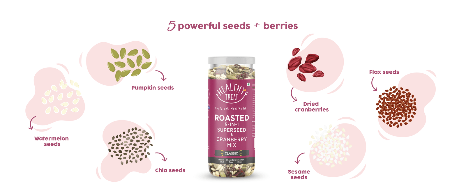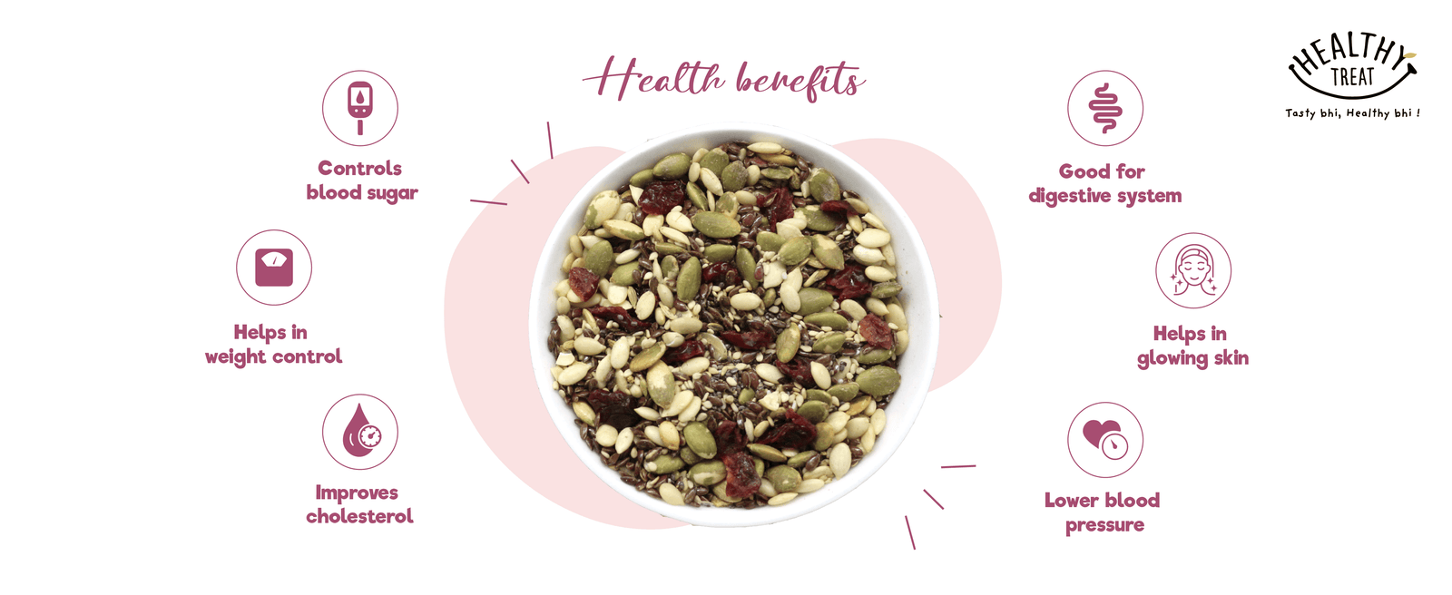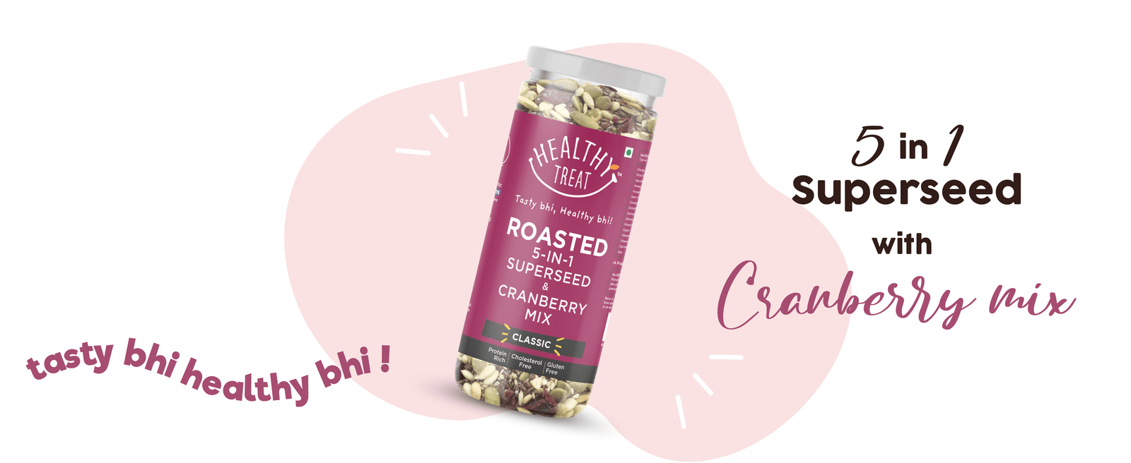"Add some crunch to your life with Healthy Treat's Roasted 5 in 1 Super Mix Seeds Classic!" A mouthwatering blend of nutritious mixed seeds; "roasted pumpkin seeds, flax seeds, watermelon seeds, chia seeds, and sesame seeds" packed with flavor and health benefits. Elevate your snacking experience with this power-packed combination!